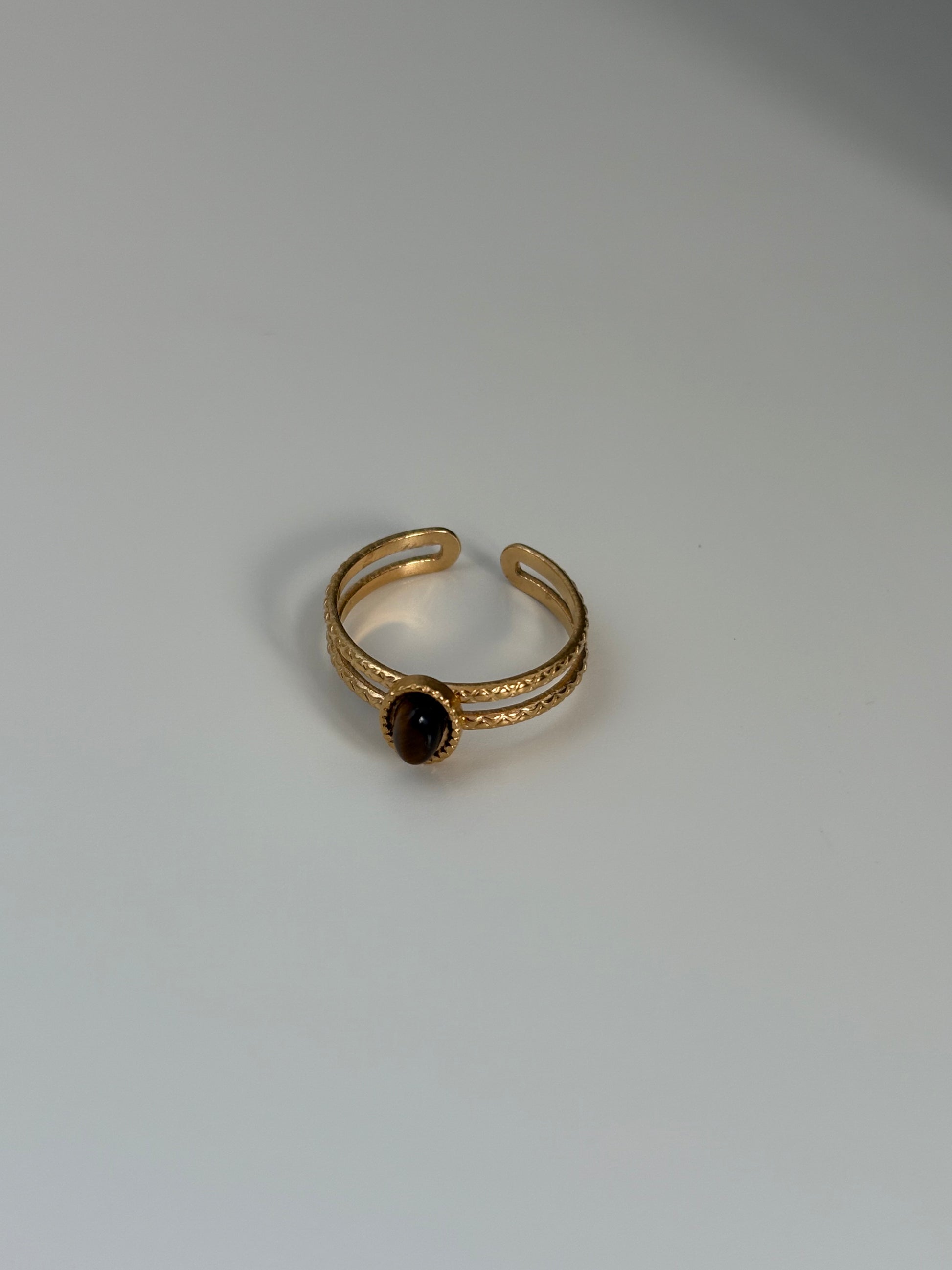- Bague dorée composée de deux anneaux surmontés d'une pierre marron