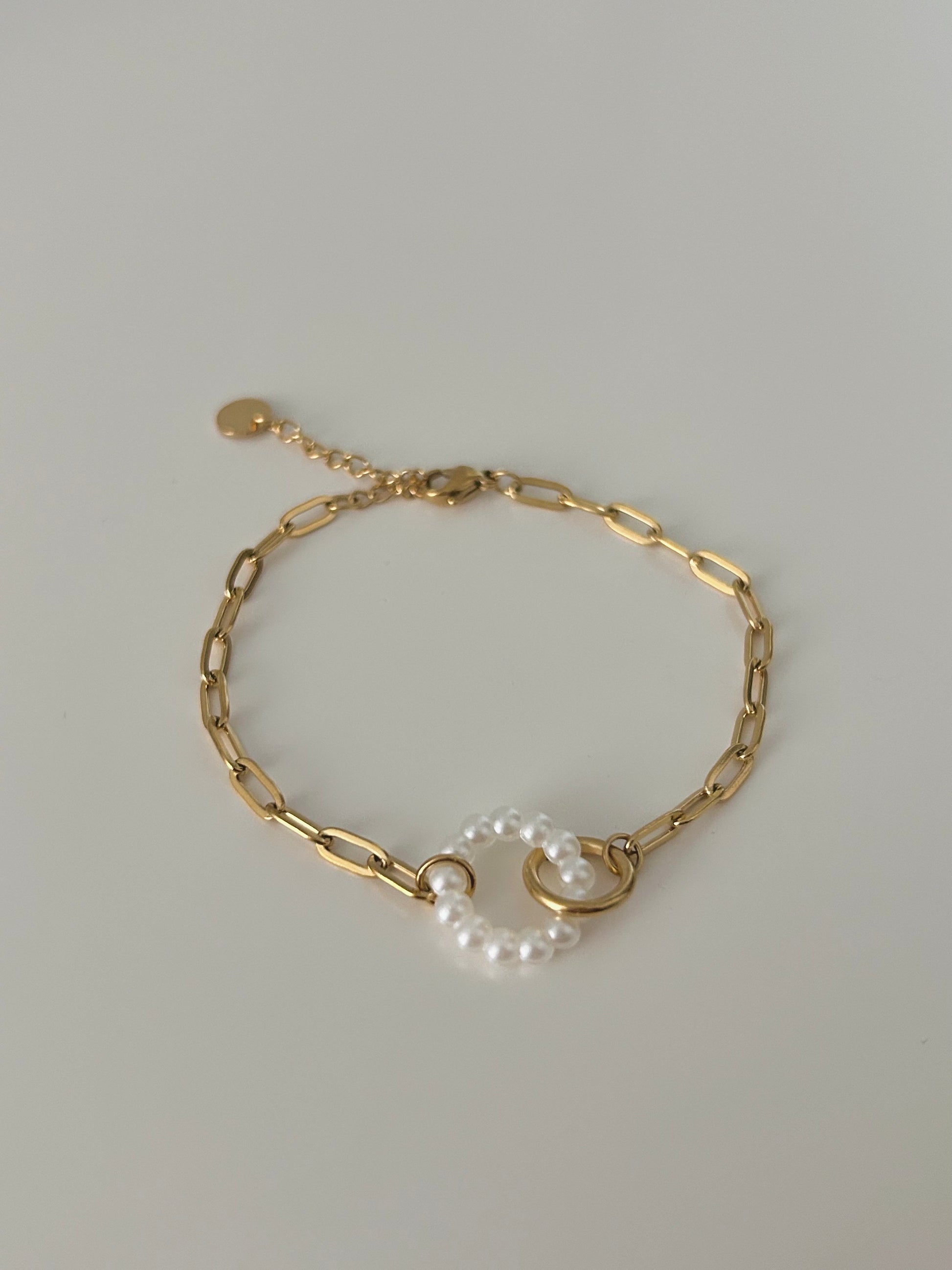 Cet élégant bracelet se compose d'une chaîne en maille dorée agrémentée d'un joli détail circulaire en perles.