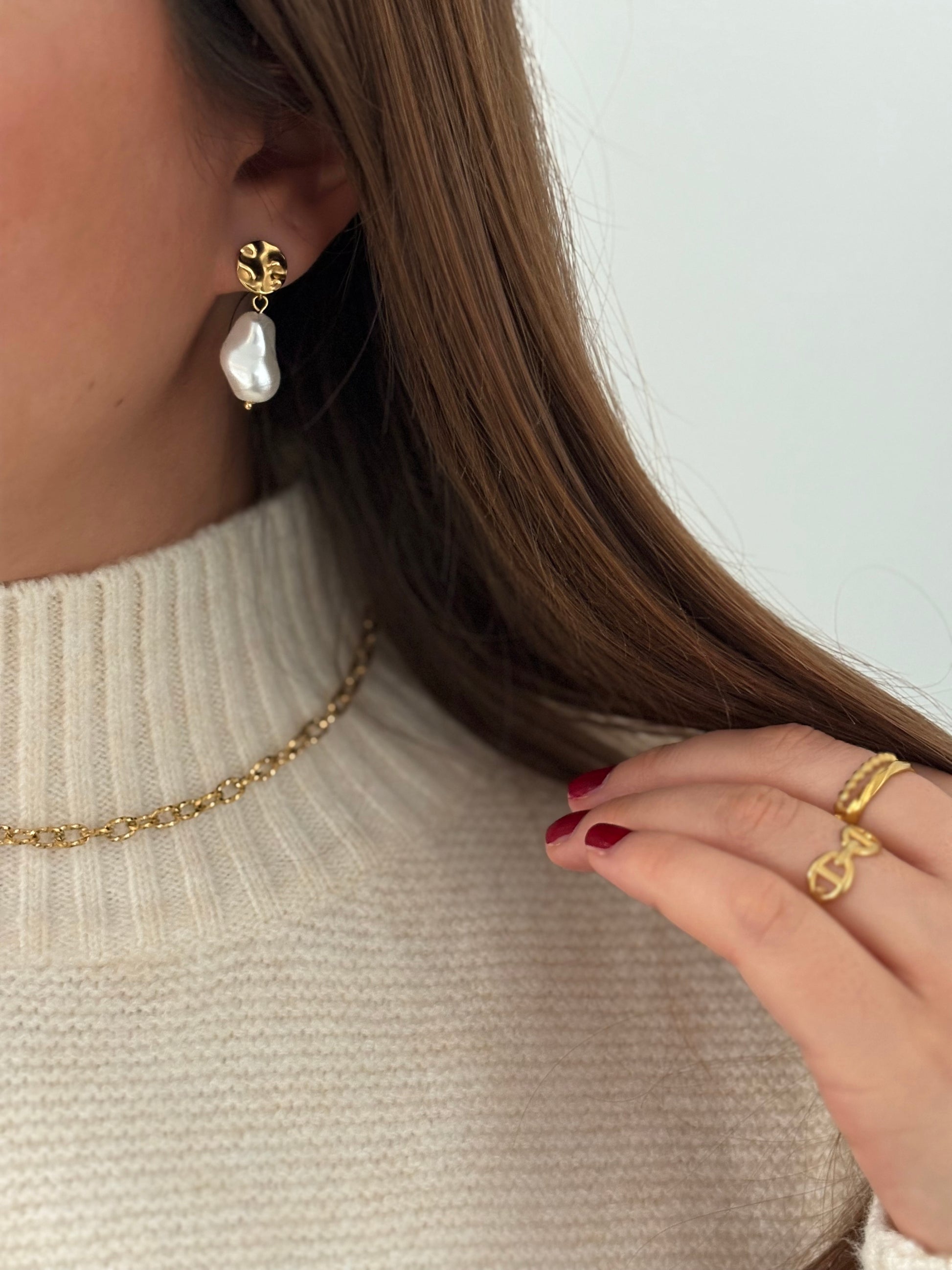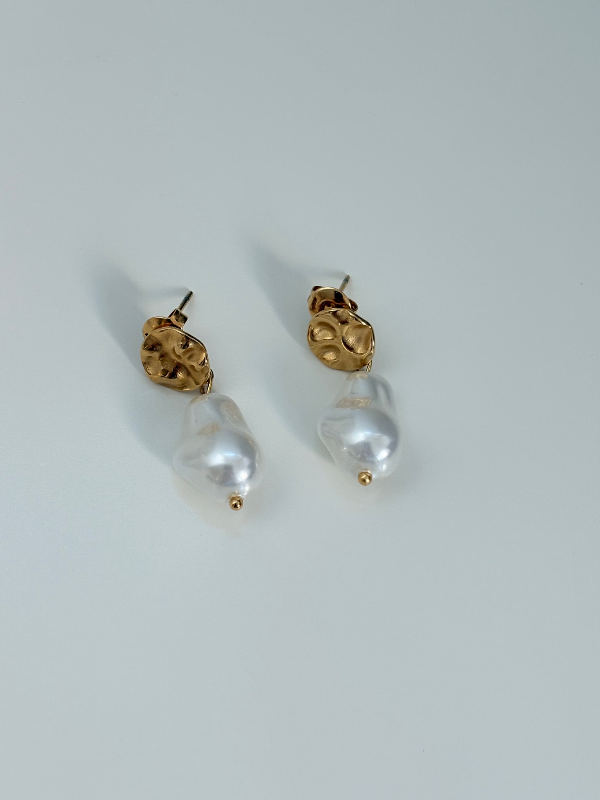 - Boucles d'oreilles pendantes dorées avec jolie perle de forme irrégulière